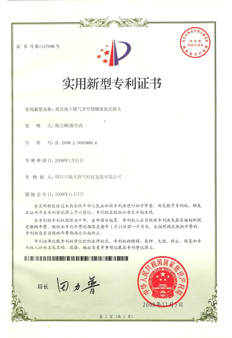 1高压地下储气井井筒硬密封式接头